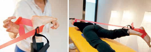 Es unterscheidet sich von den bekannten Therapiebändern durch das schmälere, jedoch stärkere hochelastische Material (5 cm breit)